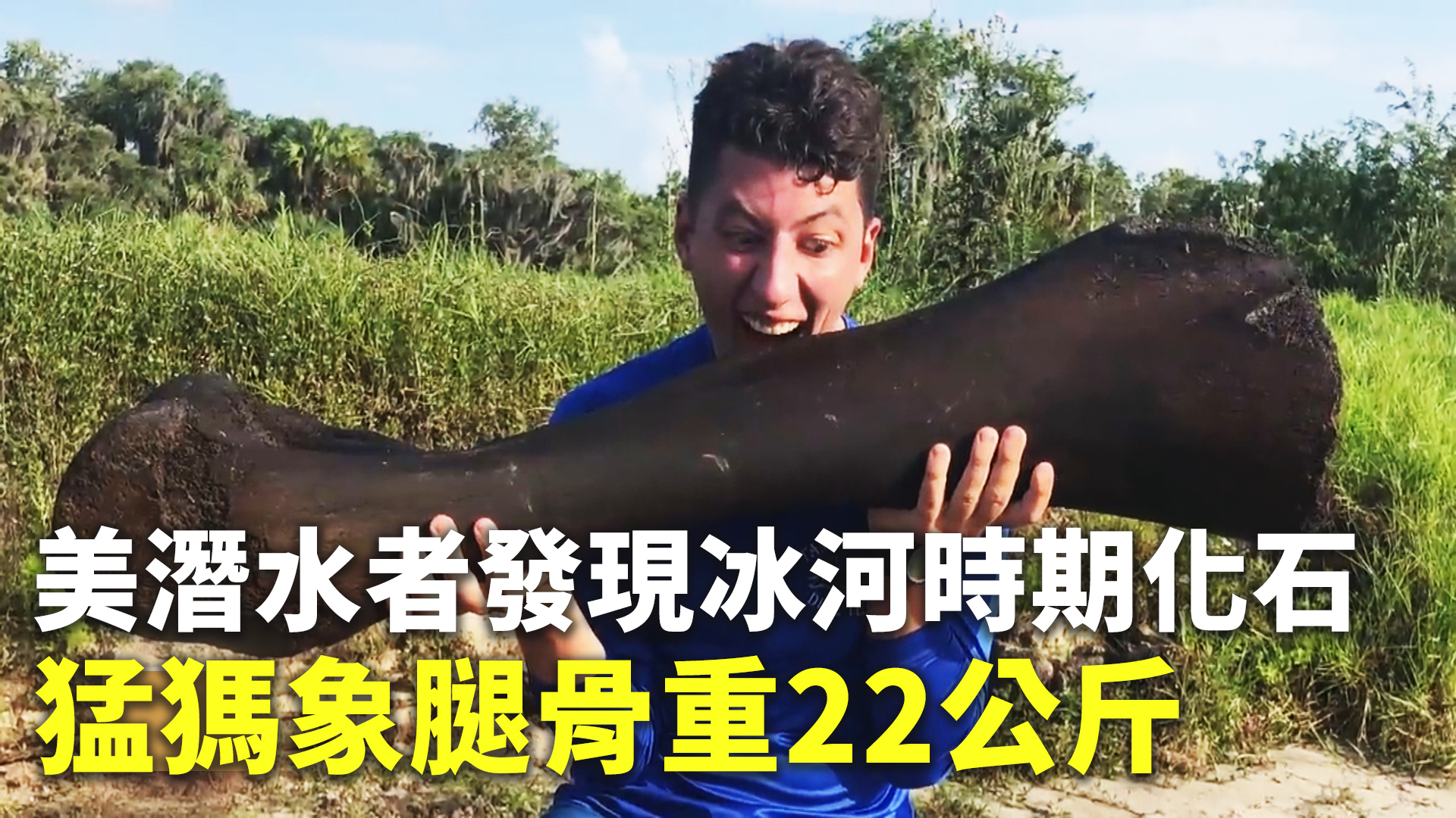 【新唐人亞太台 2021 年 06 月 11 日訊】美國佛羅里達州兩名業餘古生物學家日前在當地潛水時,意外發現一塊約1.2公尺長的巨型化石,重量達22公斤,初步證實,是距今10萬年前的猛獁象腿骨化石。