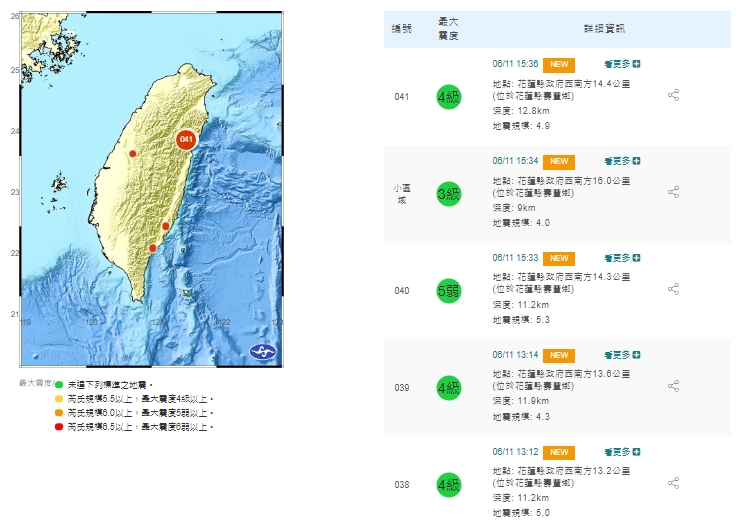 花蓮今連五震 花蓮縣地區最大震度 5弱(中央氣象局網站)