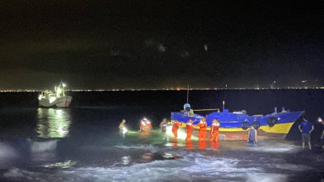 海巡署南部分署第五岸巡隊表示,海巡人員抵達現場後,確認擱淺舢舨為琉球籍「和○」號舢舨,船上有兩名船員,分別為林姓船長及其兒子,2人在海巡人員協助下,順利脫困、平安上岸。隨後由海巡人員、琉球鄉海域救難協會人員及熱心民眾共同於舢舨旁協助推帶,另由友船「金○」號漁船於海上利用繩索嘗試拖帶,相關救援工作,從12日晚間8點持續進行到10點多,歷經數次嘗試,仍未能將「和○」號舢舨成功拖離礁岩處。