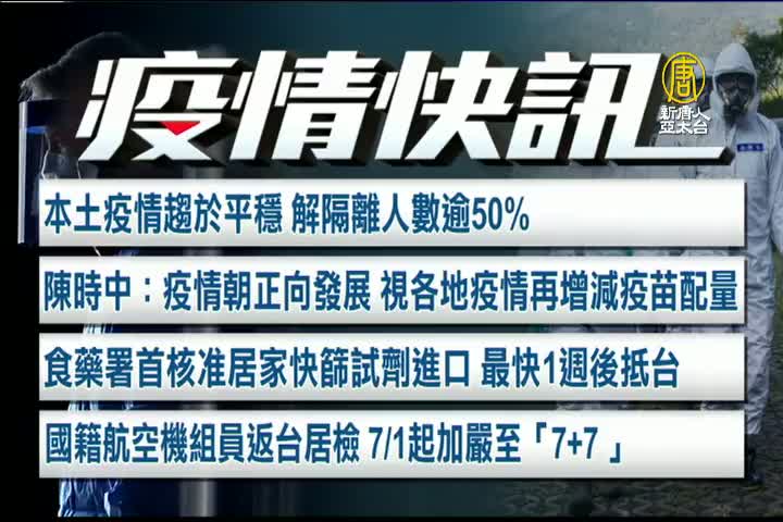 【新唐人亞太台 2021 年 06 月 14 日訊】接下來看今天的疫情快訊:本土疫情趨於平穩,解隔離人數已經超過50%。指揮中心指揮官陳時中指出:疫情朝正向發展,將視各地疫情,再增減疫苗配量。食藥署核准居家快篩試劑進口,最快1週後抵台。國籍航空機組員返台居檢,將從七月一日起,加嚴至「7+7 」。