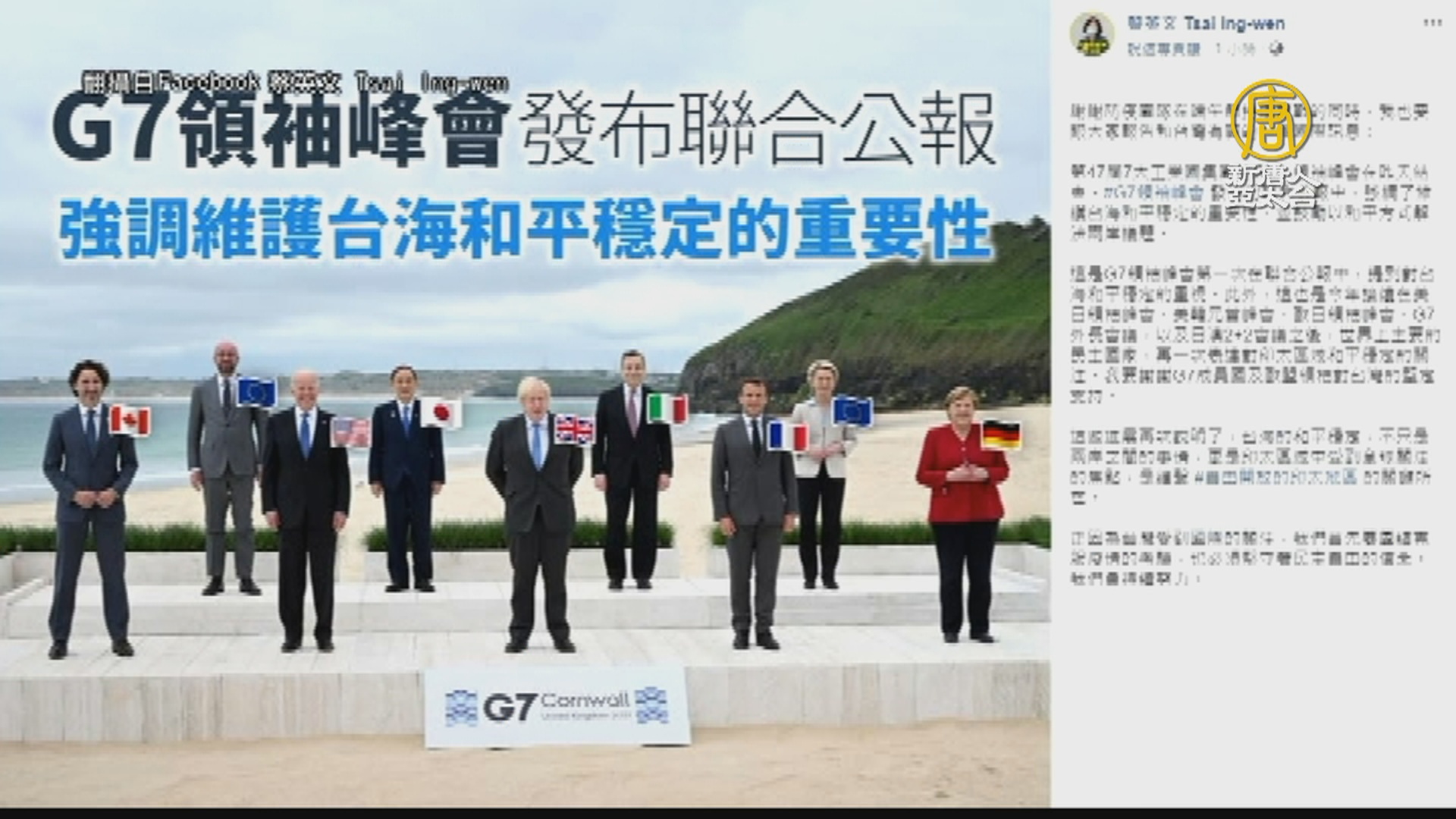 【新唐人亞太台 2021 年 06 月 15 日訊】在美日聯合聲明提出台海安全後,共機擾台的次數已下降,不過,14日,1架中共運8反潛機再侵擾台灣西南防空識別區,遭國軍廣播驅離。針對G7聯合公報首次提及台海和平穩定的重要性。總統蔡英文14日在Facebook發文感謝G7成員國與歐盟領袖對台灣的堅定支持,並強調,這些進展再次說明了台海的和平穩定,不只是兩岸之間的事情,更是印太區域中受到全球關注的焦點,是維繫自由開放的印太地區的關鍵所在。總統最後寫道「正因為台灣受到國際的關注,我們首先要團結克服疫情的考驗,也必須堅守著民主自由的信念,我們會持續努力。」