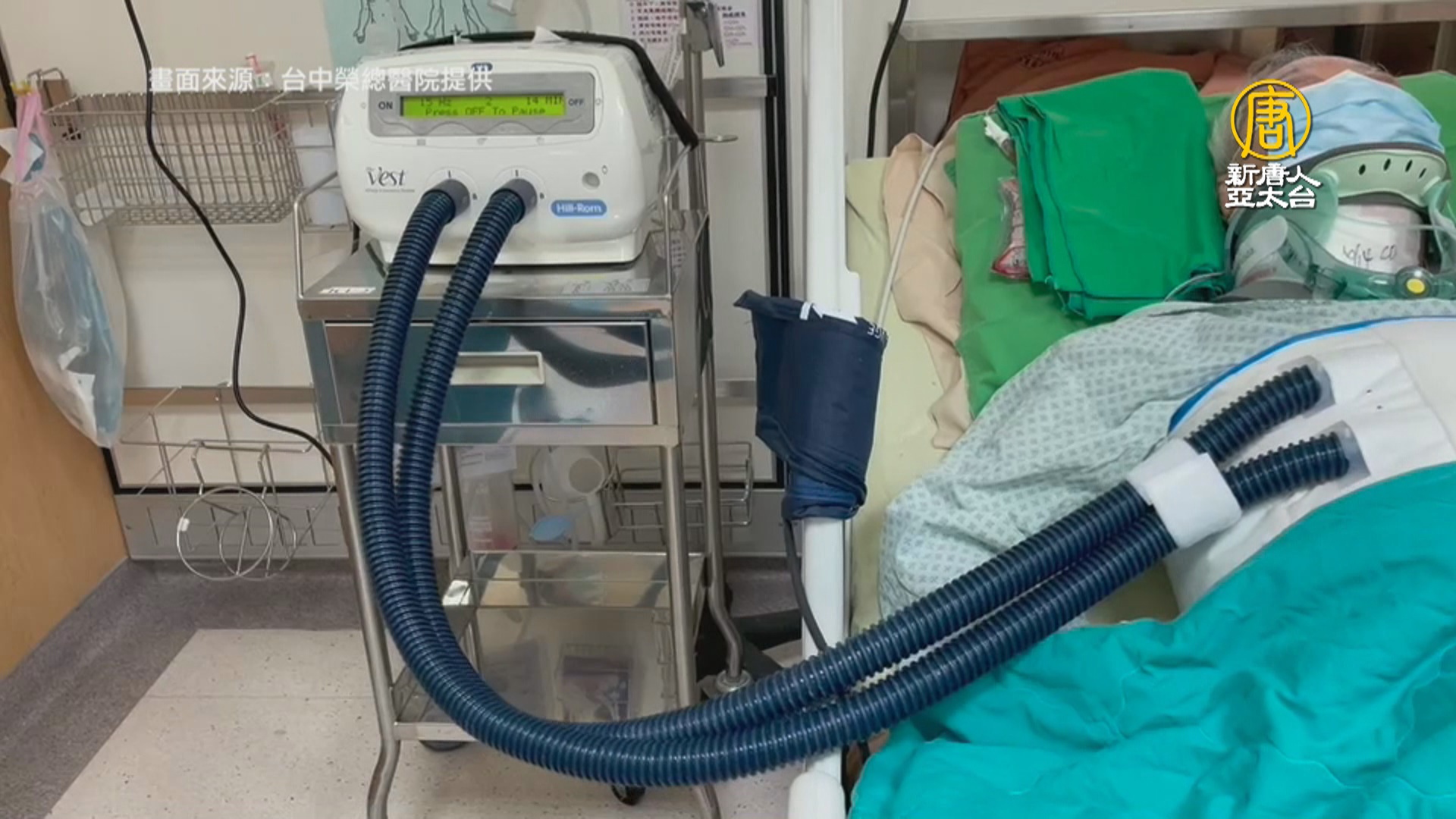 身穿隔離衣的醫護人員在隔離病房中,使用自動拍痰機幫有卡痰生命威脅的確診患者拍痰,這台要價近50萬的自動拍痰機,是台中一家餐飲集團的愛心捐贈。