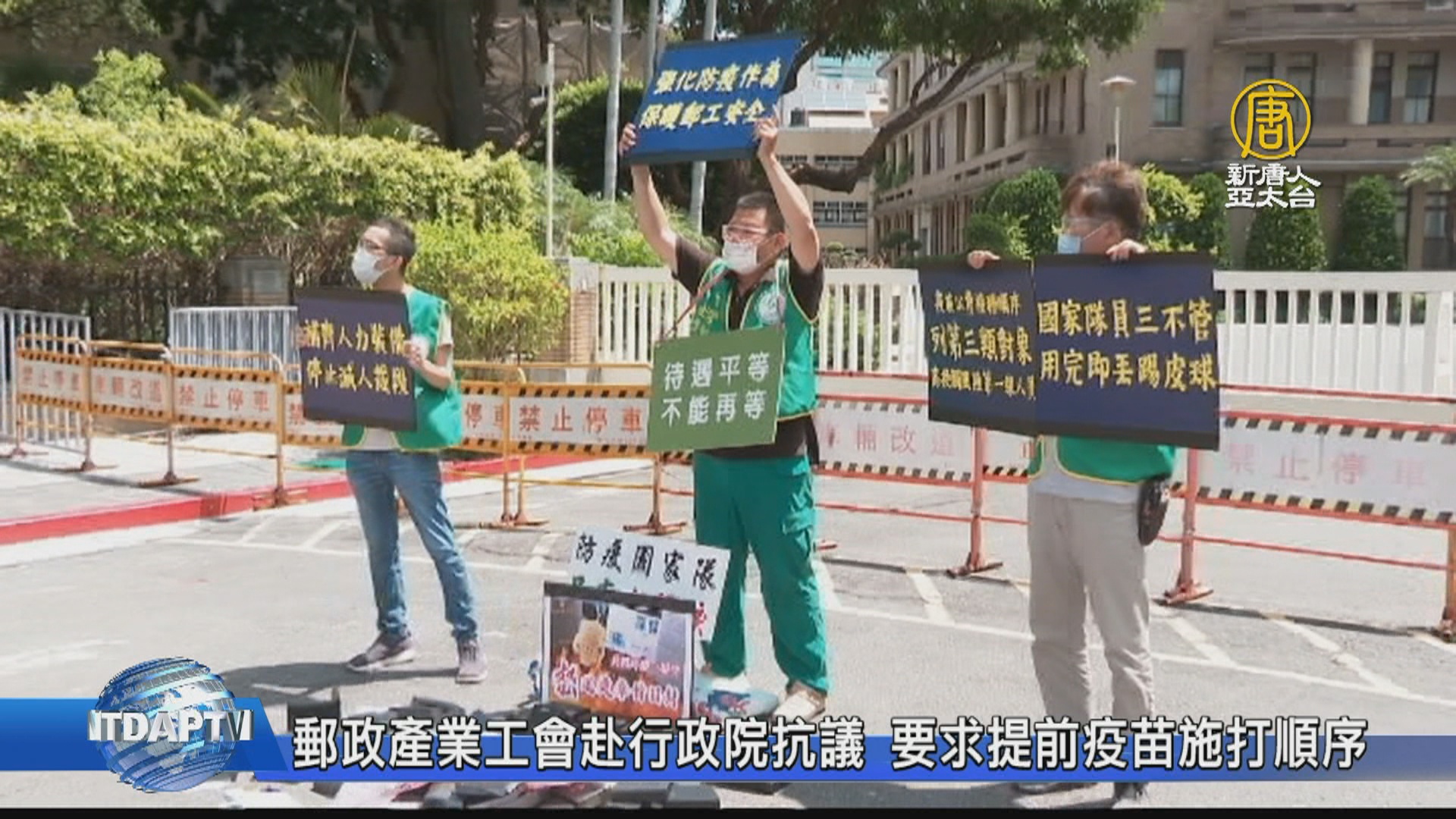 【新唐人亞太台 2021 年 06 月 18 日訊】自去年發生疫情以來,從配送酒精、口罩等重要防疫物資,到各項紓困工作,都有郵政人員的身影,他們也被政府封為「防疫國家隊」的一員,但在付出的同時,郵政人員目前已累計13人確診,台灣郵政產業工會今天就到行政院前表達訴求,希望公司和政府能強化防疫作為,保護郵工安全。除了要求要補足第一線基層人員的裝備人力外,也希望能將郵政人員的疫苗施打順序從從第7類提前到第3類。中華郵政發言人表示,員工的心聲他們都有聽見,已經報請交通部去跟中央反應。