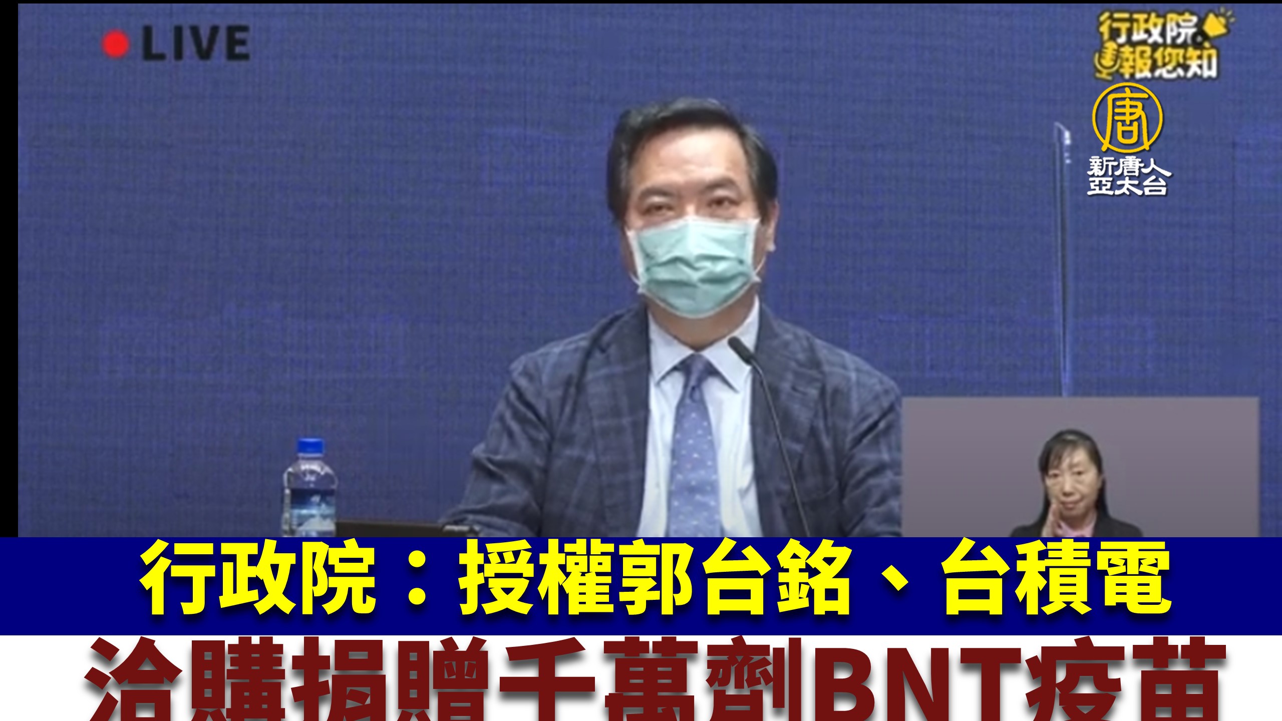 行政院18日中午召開記者會表示,為確保國人健康,積極向外界洽談購買疫苗,感謝民間企業積極的協助購買,政府願意提供所有必要協助。針對郭台銘採購疫苗部份,政府將會正式發函授權台積電及永齡基金會,分別代表政府洽談500萬劑BNT疫苗捐贈給政府。