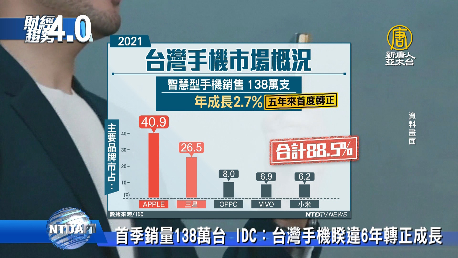 【新唐人亞太台 2021 年 06 月 19 日訊】手機換機潮效應逐步浮現,IDC數據顯示,今年首季台灣智慧型手機,銷售138萬支,是睽違五年以來重回正成長腳步,今年台灣本土疫情,的確嚴重影響內需市場,不過研調機構樂觀預估,全年台灣手機市場,依舊能保持正成長,年增幅度達1.2%。