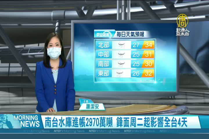 【新唐人亞太台 2021 年 06 月 21 日訊】歡迎您收看6月21日的早安新唐人,我是唐潔安,先來帶您關心天氣。又是一個星期的開始了,昨天南台灣遇豪雨,水利署估計,全台水庫將可進帳2970萬噸,今天(21日)是24節氣的「夏至」,氣象局今晨對苗栗以南10縣市發布豪大雨特報。水利署也對南投縣發布一級淹水警戒,對台中市、苗栗縣發布二級淹水警戒。預期典型的梅雨滯留鋒面,從週二到週五會影響全台四天,提醒觀眾朋友留意,帶您一起來看到國際媒體重要訊息。