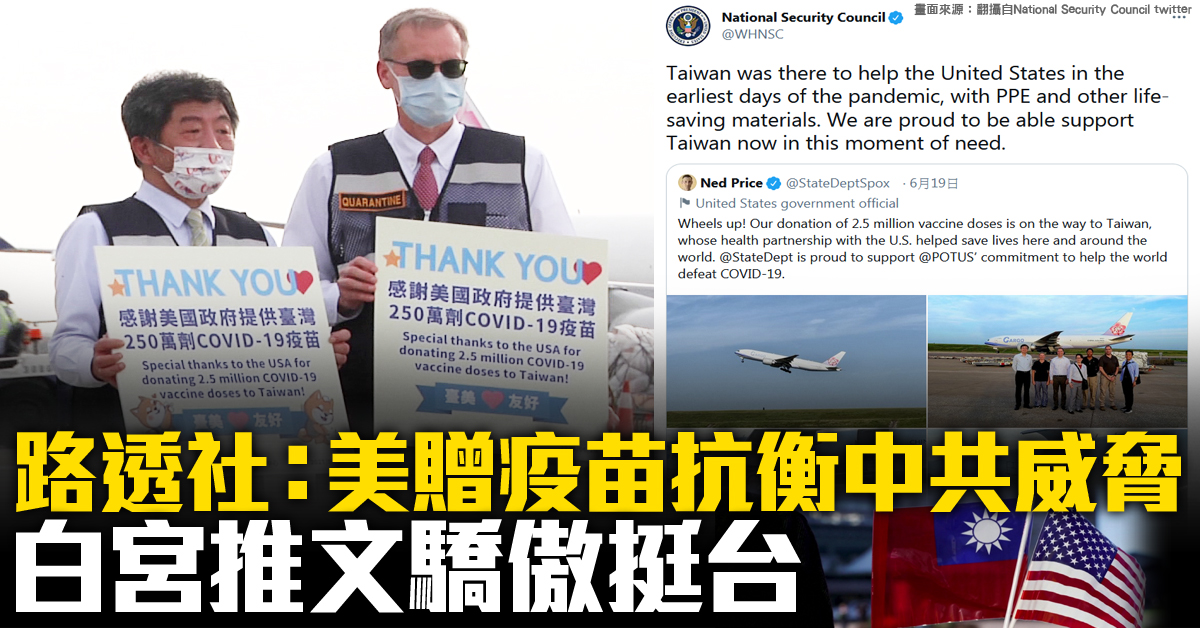 路透社:美贈疫苗抗衡中共威脅 白宮推文驕傲挺台