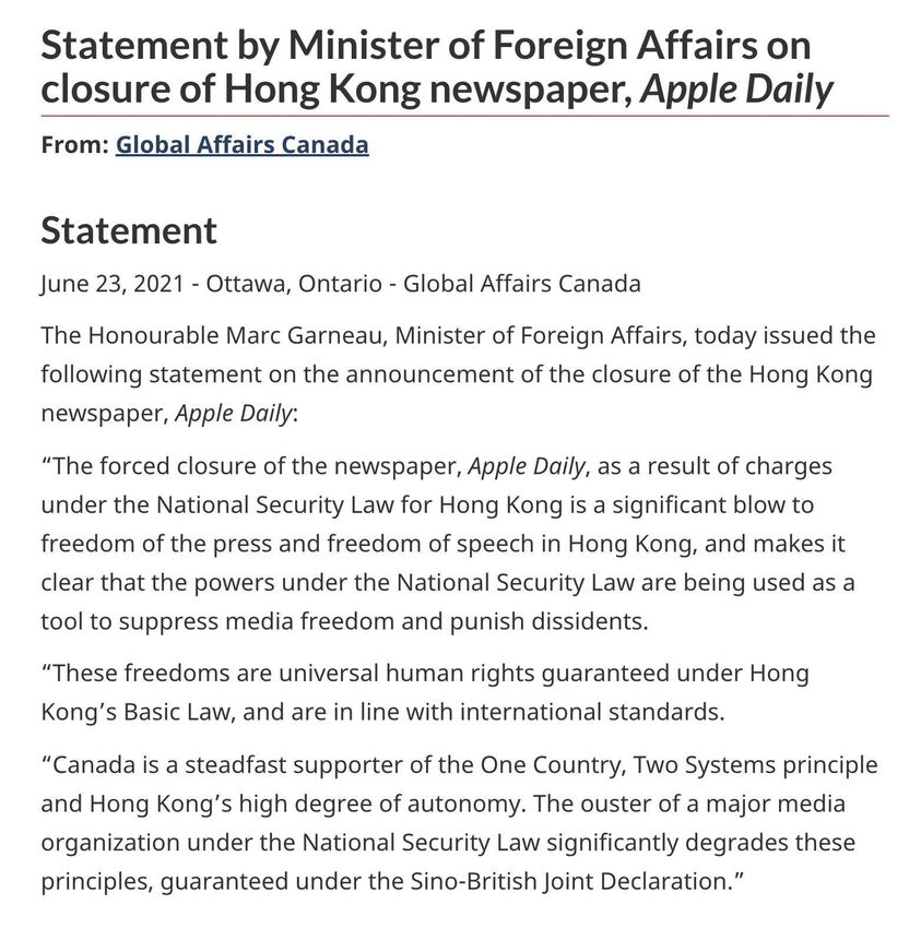 聲明指出,「加拿大是(香港)一國兩制原則和香港高度自治的堅定支持者。(當局)以『國安法』為由,使一家主要媒體出局,顯著降低了受《中英聯合聲明》保障的這些原則。」