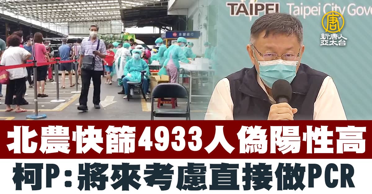 【新唐人亞太台 2021 年 06 月 24 日訊】指揮中心(24日)公布「市場專案」精進作為。而周三(23日)晚間,台北市長柯文哲與中央開會討論整合北農疫調問題,台北市長柯文哲今天表示,北農專案沒有外界想的那麼可怕,現在快篩已做了4933人,陽性率只有0.3%,而且發現快篩的偽陽性率很高,未來將考慮直接做PCR。