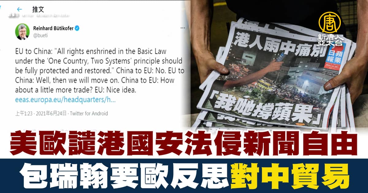 歐洲議會對中關係代表團團長、德國政治家包瑞翰(Reinhard Butikofer),在推特轉發了歐盟對外事務部發言人的聲明,並在文中暗示,歐盟既然清楚中共未遵守對香港一國兩制的承諾,就必須再想想是否要跟中國繼續「更多的貿易」(a little more trade)交流。