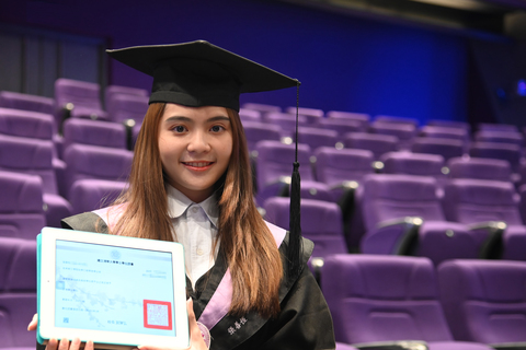 清華大學今年畢業生張善恆開心捧著她的第一張數位學位證書。(清華大學提供)