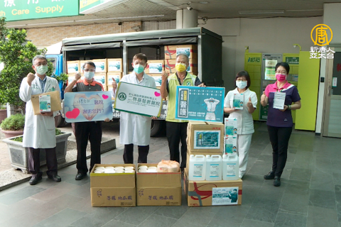 滿載醫療物資的大貨車緩緩開進來,停靠後志工們開始卸貨,抗疫物資召集人張家倫表示,前彰化縣議員李俊諭,來電告知偏鄉醫院醫療物資告急,因此發起「行動挺醫護守護第一線」捐贈醫療物資活動,前議員開的豆花店也捐贈100份豆花,給醫護們在夏日裡消消暑。
