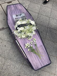 集會結束後,棺材、花圈和幾份《蘋果日報》被留在中使館的門牌之下。