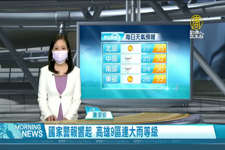 【新唐人亞太台 2021 年 06 月 28 日訊】歡迎您收看6月28日的早安新唐人,我是唐潔安,先來帶您關心天氣。又是一個星期的開始了,高雄受西南風影響,今持續下起大雷雨,根據高雄氣象站今早資料顯示,總計9區均達到大雨等級。另外,清晨氣象局也對台中以南8縣市發布大雨特報,提醒觀眾朋友留意。帶您一起來看到國際媒體重要訊息。