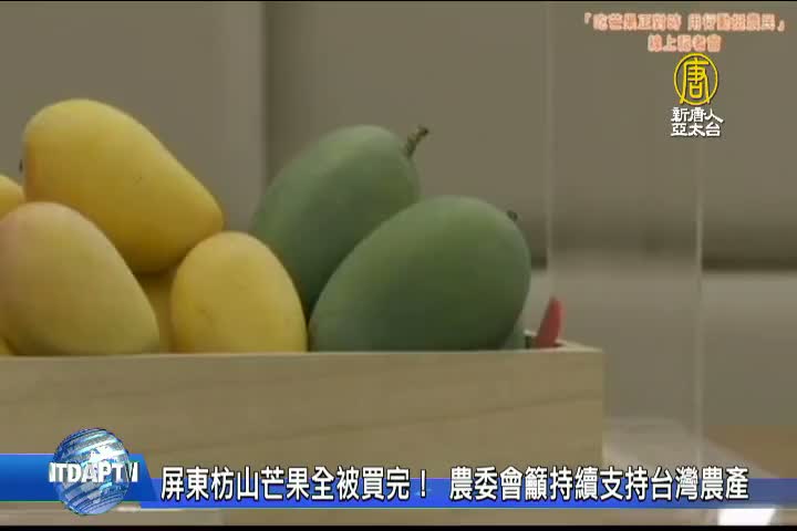 【新唐人亞太台 2021 年 06 月 29 日訊】屏東枋山芒果傳出被退訂,消息傳出後,農委會立刻媒合國營企業等單位支持,27日就媒合銷售了3000多箱,農委會表示,枋山芒果現在都賣光了,甚至已出現貨源不足現象,但還是呼籲民眾能持續支持其它產區的芒果,力挺台灣農民。農委會表示,台灣農產外銷今年1月到6月28號,外銷總量是3721公噸,比往年同期減少18%,主要是因為中國大陸市場減少所致,但其他市場都大幅增加,