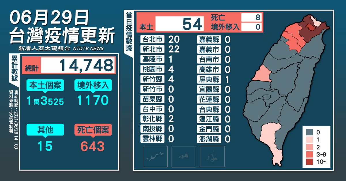 【新唐人亞太台 2021 年 06 月 29 日訊】今(29)日中央流行疫情指揮中心公布,國內新增54例本土個案;另確診個案中新增8例死亡。