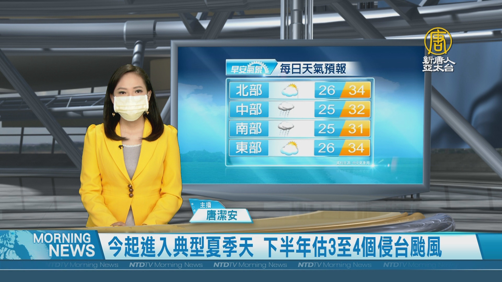 【新唐人亞太台 2021 年 06 月 30 日訊】歡迎您收看6月30日的早安新唐人,我是唐潔安,先來帶您關心天氣。今天開始,太平洋高壓增強後,台灣將進入典型夏季天氣,高溫炎熱,午後有短暫雷陣雨;另外,今年5月創74年來最熱,今年夏季依然偏熱,氣象局預估,今年下半年,侵台的颱風數量以接近正常的機率較大,約三到四個。帶您一起來看到國際媒體重要訊息。