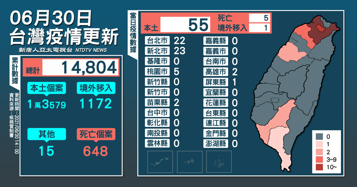 【新唐人亞太台 2021 年 06 月 30 日訊】今(30)日中央流行疫情指揮中心公布,國內新增55例本土及1例境外移入;另確診個案中新增5例死亡。
