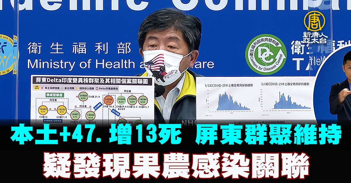指揮中心宣布周四新增47例本土個案,和3例境外移入。不過死亡數是終止連四天的個位數,新增了13例。而屏東Delta群聚案維持15例確診,指揮中心研判,案14734及案14816這對果農夫婦,和祕魯祖孫的鄰居案14407,曾在同一天去過枋寮醫院,認為有可能是看診診間在附近,造成接觸感染。