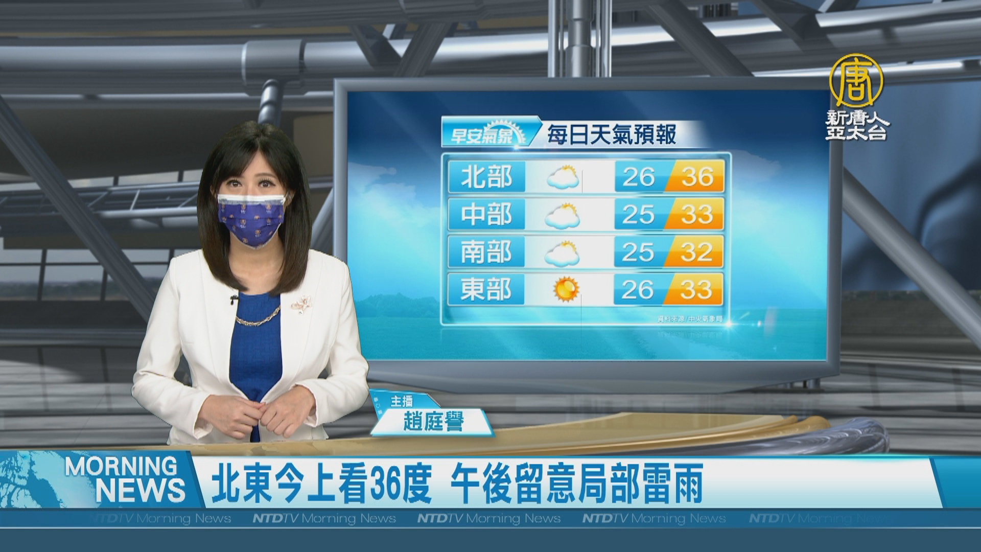 【新唐人亞太台 2021 年 07 月 02 日訊】歡迎您收看7月2日的早安新唐人,我是趙庭譽,先來帶您關心天氣。受到太平洋高壓影響,今天全台天氣呈現穩定狀態,僅午後各地山區、北部及東部局部地區有零星雷雨,氣溫方面,北部及花東部分地區易突破36度。帶您一起來看到國際媒體重要訊息。