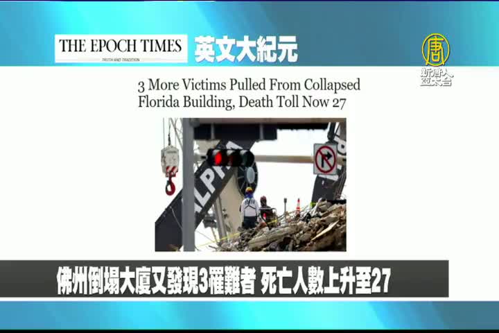 【新唐人亞太台 2021 年 07 月 06 日訊】首先來看到美國大紀元英文版報導:美國佛羅里達州倒塌大廈又發現3名罹難者,死亡人數上升至27人。