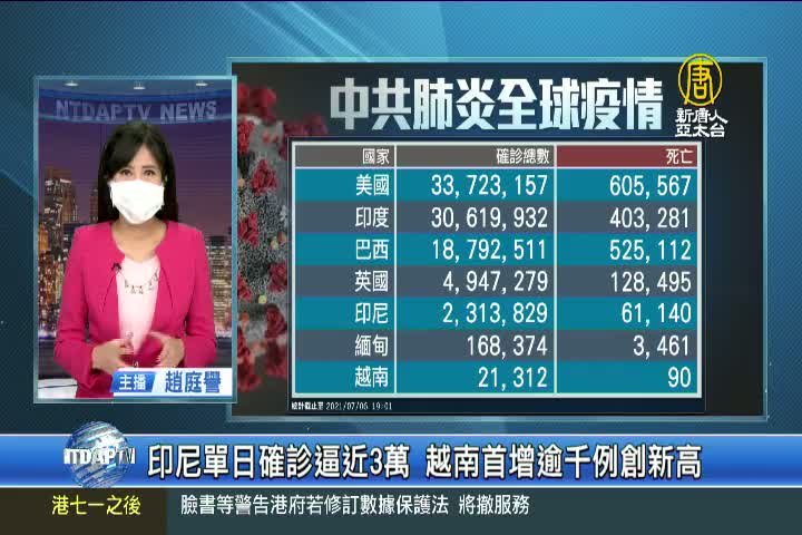 【新唐人亞太台 2021 年 07 月 06 日訊】來關心中共肺炎疫情最新情況,全球確診超過1億8千415萬人,死亡3百98萬4千多人。但中共、伊朗等國家,被認為嚴重低報數據。亞洲方面,印尼5日新增將近3萬例確診,雅加達接連2天突破1萬人確診,由於Delta變種病毒肆虐,過去1週以來,印尼每日新增確診病例都在2萬以上、超過400人死亡。緬甸週一通報新增將近3千例確診,創下自去年疫情以來的單日新高;越南首次單日新增超過1千例,同樣創下疫情發生以來新高紀錄,其中有8成都是感染Delta變種病毒。南太平洋島國斐濟也因Delta快速變種病毒擴散,造成確診激增,單日新增522例創下新高。英國新增確診2萬7千多例,病例比前一週增加超過53%。