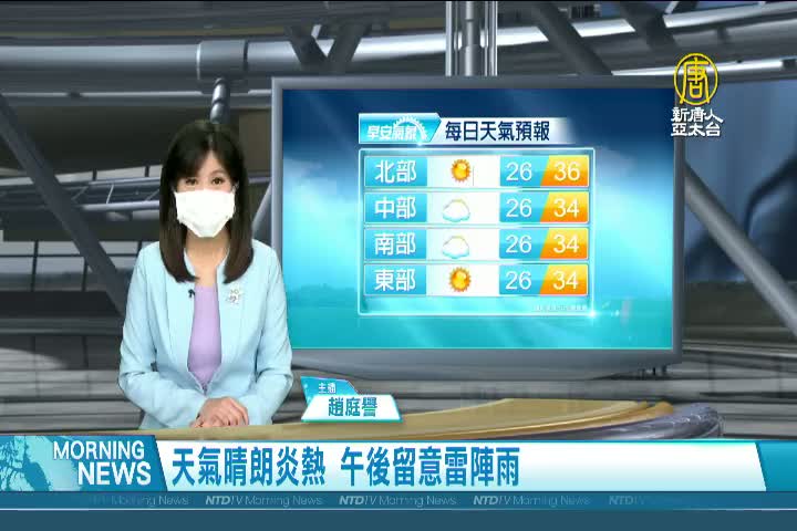 【新唐人亞太台 2021 年 07 月 08 日訊】歡迎您收看7月8日的早安新唐人,我是趙庭譽,先來帶您關心天氣。今天各地天氣晴朗炎熱,宜蘭地區有出現36度以上高溫的機會,提醒觀眾朋友留意午後局部雷陣雨,有機會持續一個禮拜。帶您一起來看到國際媒體重要訊息。