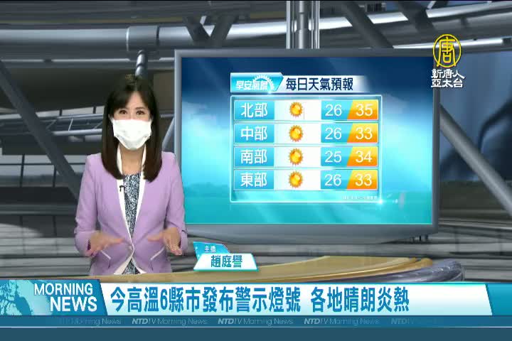 【新唐人亞太台 2021 年 07 月 09 日訊】歡迎您收看7月9日的早安新唐人,我是趙庭譽,先來帶您關心天氣。今天各地晴朗炎熱,大台北地區、山區午後有局部短暫雷陣雨,各地高溫普遍可以來到32至35度,尤其宜蘭、大臺北地區、高屏及花蓮縱谷有局部36度以上高溫發生的機率,提醒觀眾朋友留意。帶您一起來看到國際媒體重要訊息。