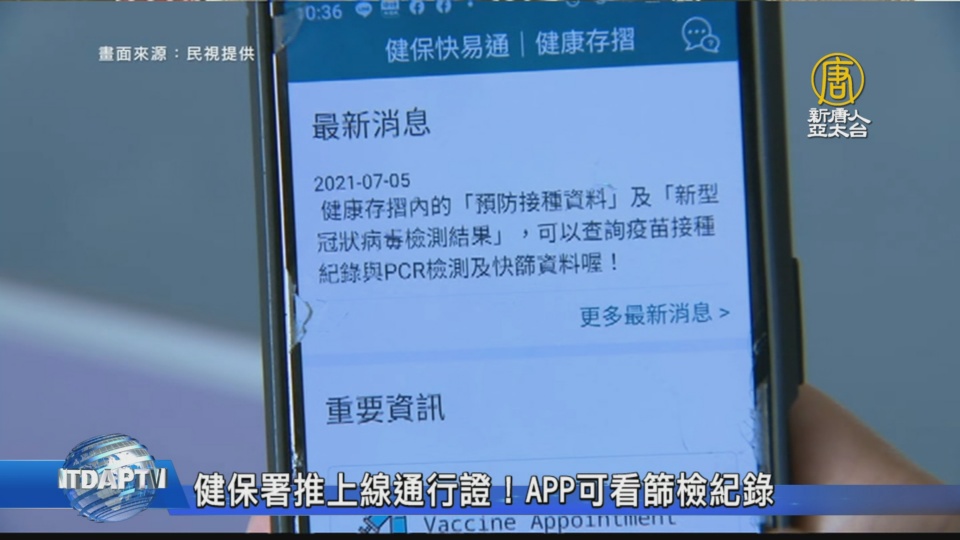 【新唐人亞太台 2021 年 07 月 10 日訊】台灣確診人數逐漸下降,因應未來解封,各行各業可能會有通行管制措施,健保署整合民眾的篩檢證明和疫苗接種紀錄,只要下載健保快易通APP,就可以使用COVID-19通行證,出示相關證明。未來也會推出英文版,在通過國際認證後,作為疫苗護照使用。