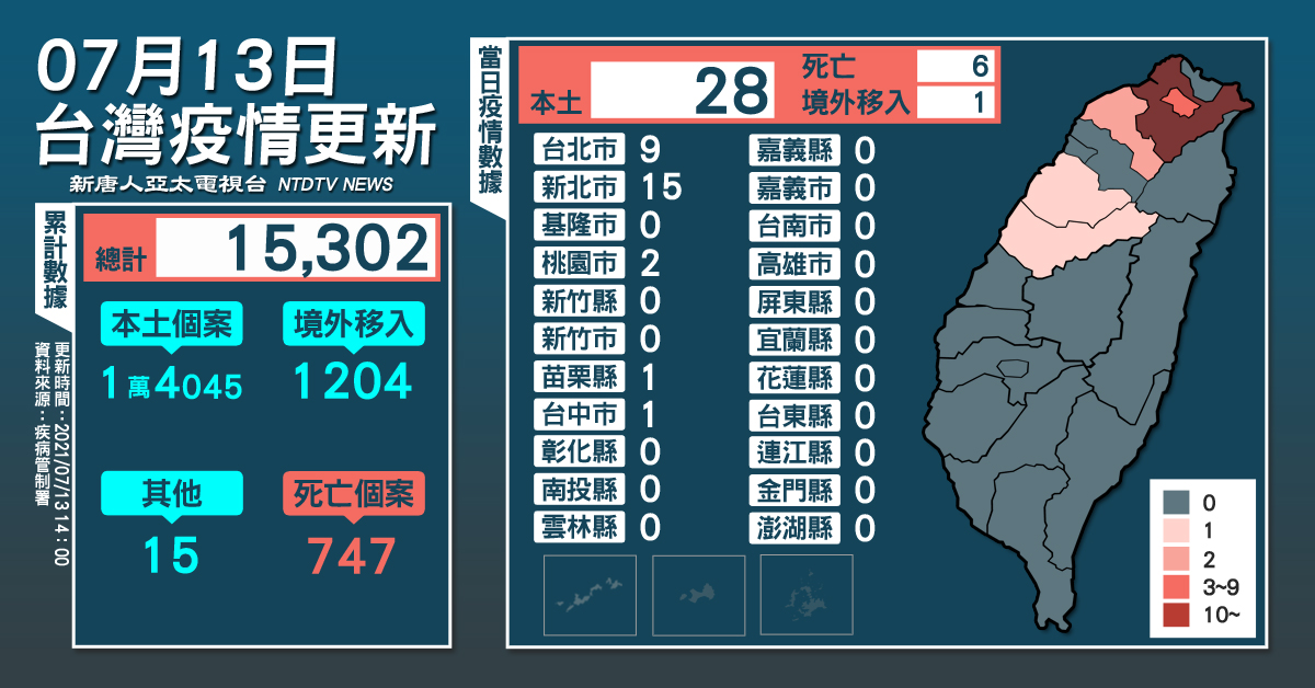【新唐人亞太台 2021 年 07 月 13 日訊】今(13)日中央流行疫情指揮中心公布,國內新增28例本土及1例境外移入;另確診個案中新增6例死亡。