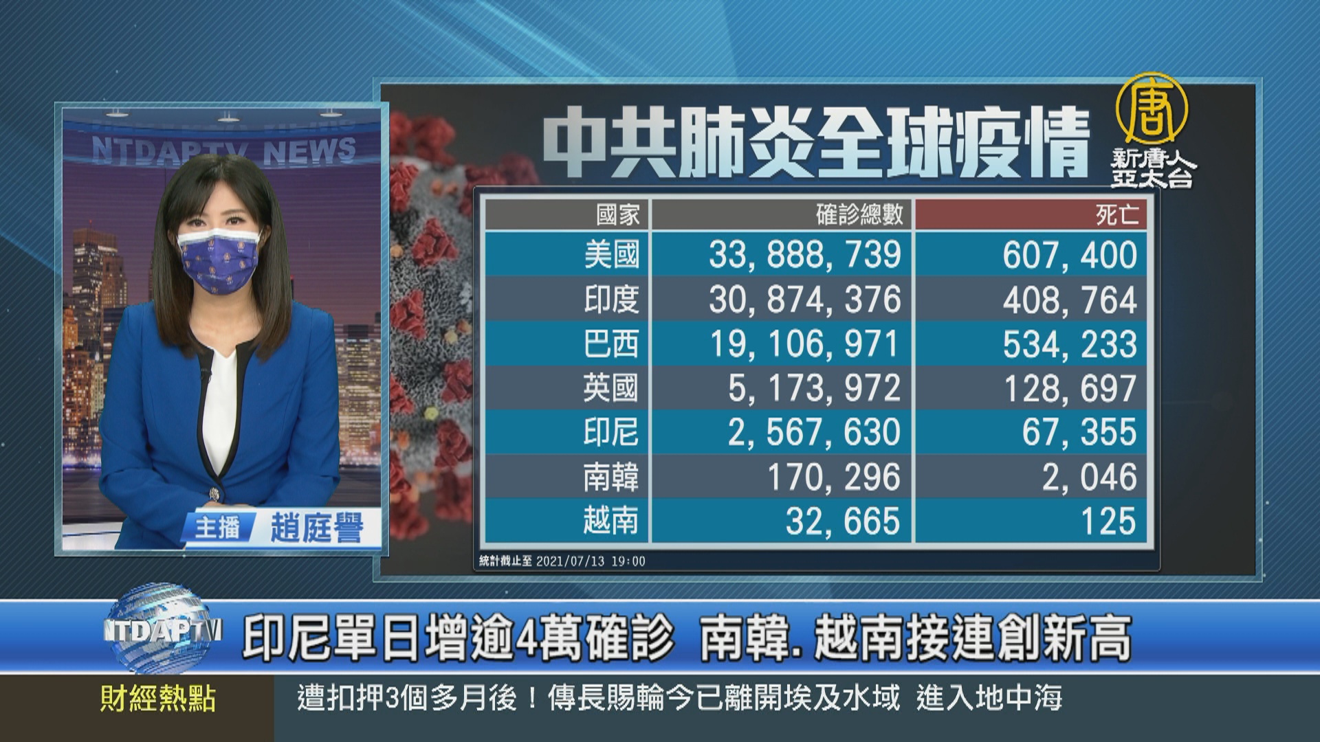 【新唐人亞太台 2021 年 07 月 13 日訊】來關心中共肺炎疫情最新情況,全球確診超過1億8千725萬人,死亡4百03萬9千多人。但中共、伊朗等國家,被認為嚴重低報數據。世界衛生組織表示,目前Delta變種病毒正快速在世界各地蔓延,已經有超過104個國家出現,很快將成為全球傳播的主流病毒株。亞洲方面,印尼12日新增超過4萬例確診,創下單日新高紀錄。南韓新增確診1千150例,連續七天破千例,感染Delta變種案例在近一週內增加374例。越南12日新增2千3百多例本土病例,一連5天刷新紀錄,也是從去年疫情爆發以來,首次單日超過2千人確診。緬甸12日新增確診首次超過5千人的新高紀錄。歐洲方面,英國新增確診3萬4千多例,1個多月來,每日確診數不斷上升。法國近日疫情有回溫跡象,目前單日確診回升到近4千例。