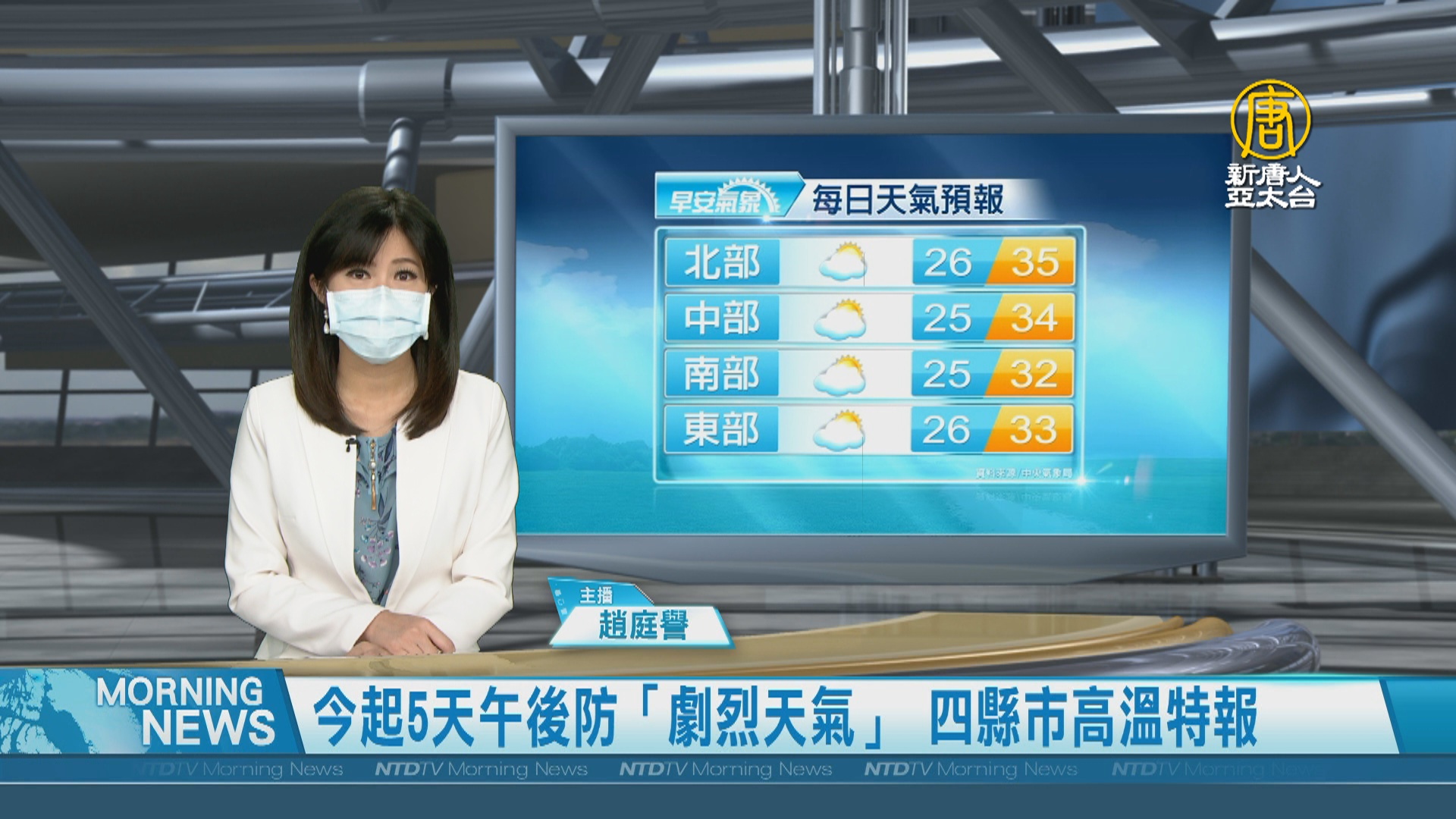 【新唐人亞太台 2021 年 07 月 15 日訊】歡迎您收看7月15日的早安新唐人,我是趙庭譽,先來帶您關心天氣。今天午後各地都容易有午後雷陣雨,尤其是中南部地區容易有局部大雨或豪雨發生機率。氣象局也對花蓮、台東、雙北、宜蘭發部高溫警示。帶您一起來看到國際媒體重要訊息。