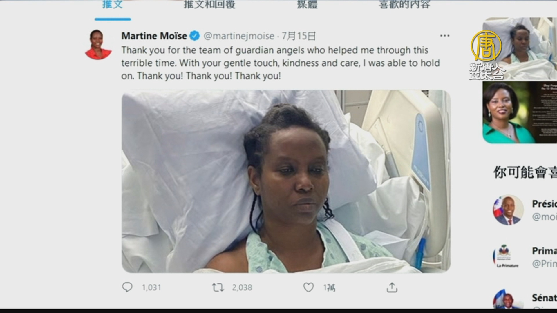 【新唐人亞太台 2021 年 07 月 16 日訊】台灣友邦海地總統摩依士7日遇刺身亡,第一夫人瑪婷也身受重傷。15日,瑪婷首度公開自己遇襲後的照片,感謝醫護人員的照護。另外,海地暗殺事件的調查進展撲朔迷離,涉及哥倫比亞傭兵、摩依士的維安人員、政界商界人士等。