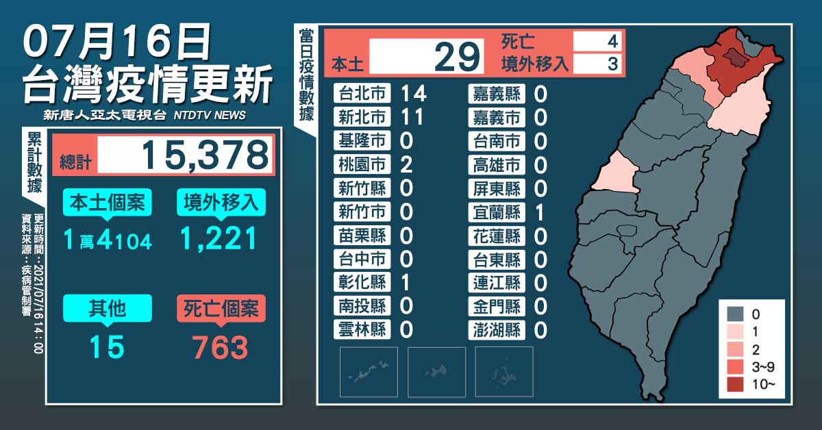 【新唐人亞太台 2021 年 07 月 16 日訊】今(16)日中央流行疫情指揮中心公布,國內新增29例本土及3例境外移入;另確診個案中新增4例死亡。