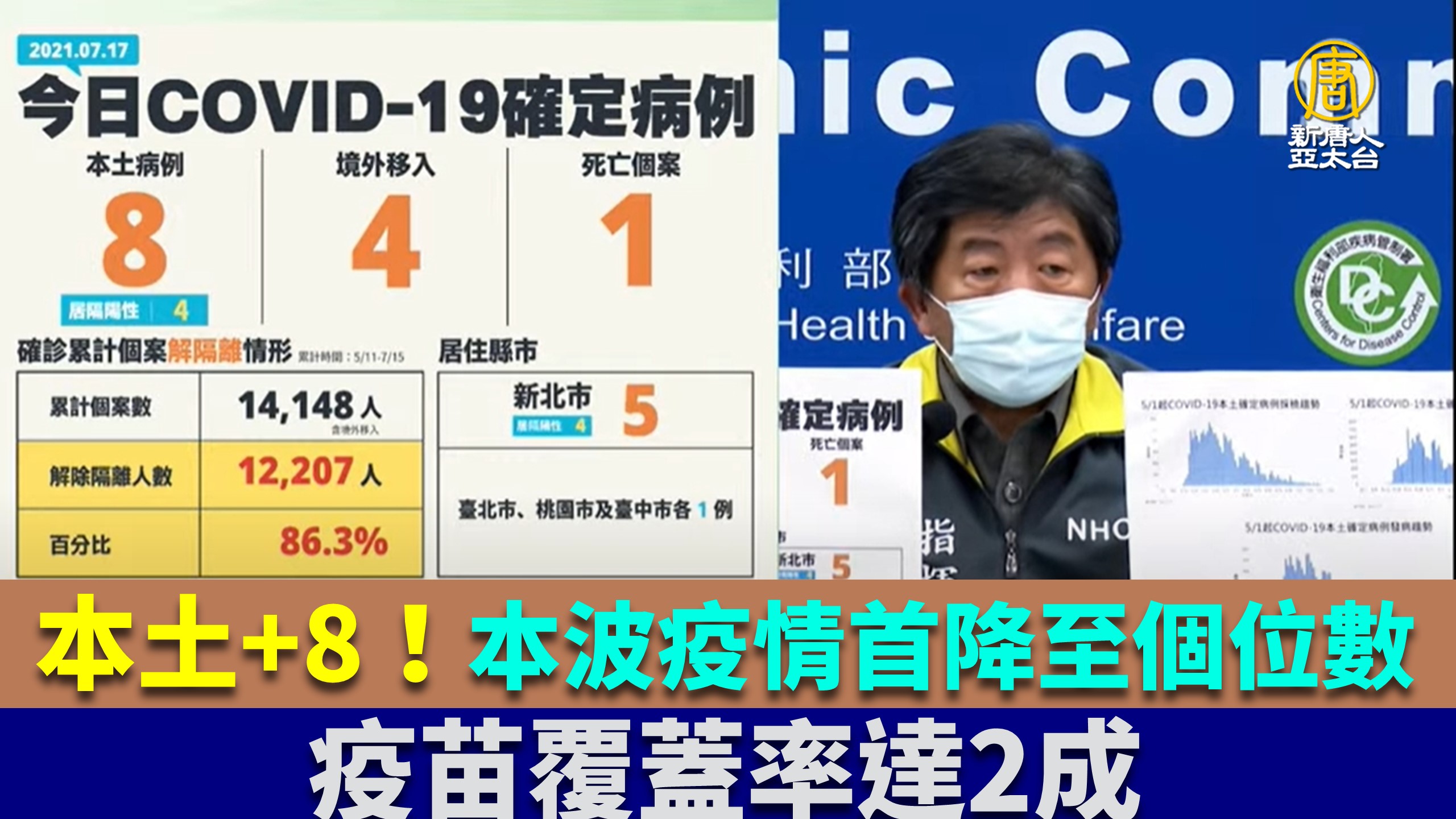 【新唐人亞太台 2021 年 07 月 17 日訊】今(17)日中央流行疫情指揮中心公布,國內新增8例本土及4例境外移入;另確診個案中新增1例死亡。