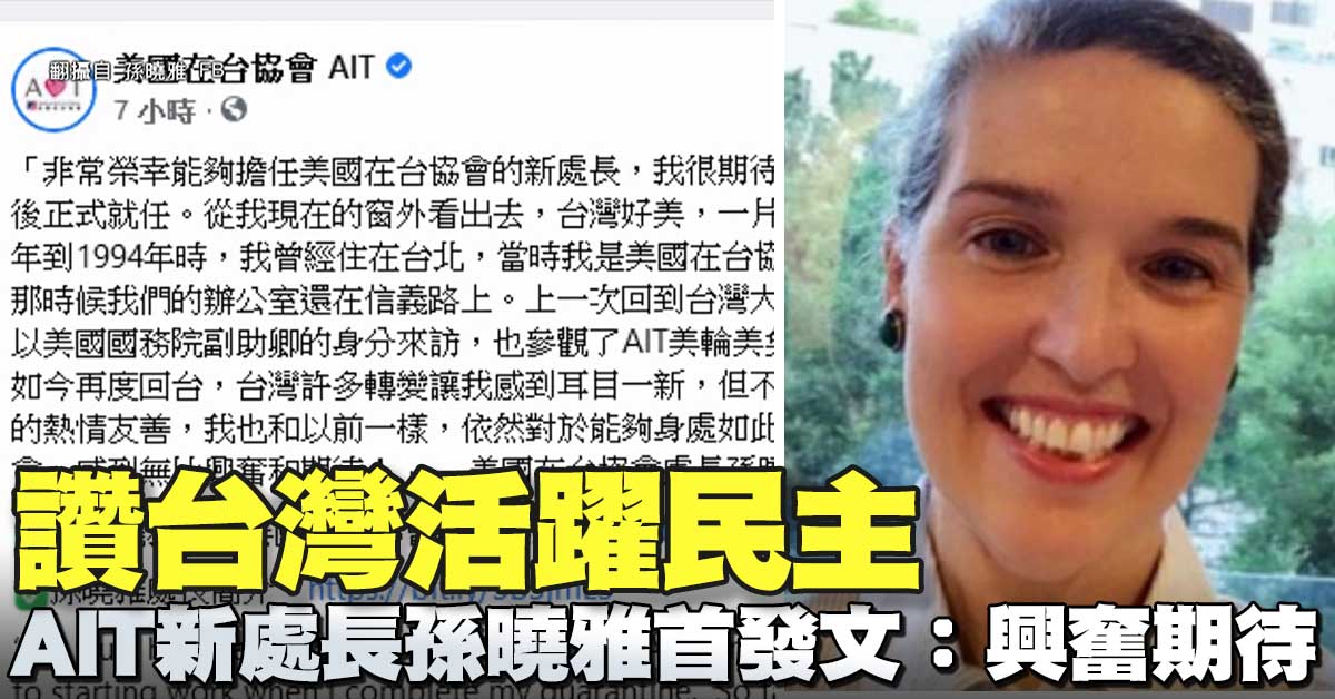 讚台灣活躍民主 AIT新處長孫曉雅首發文:興奮期待