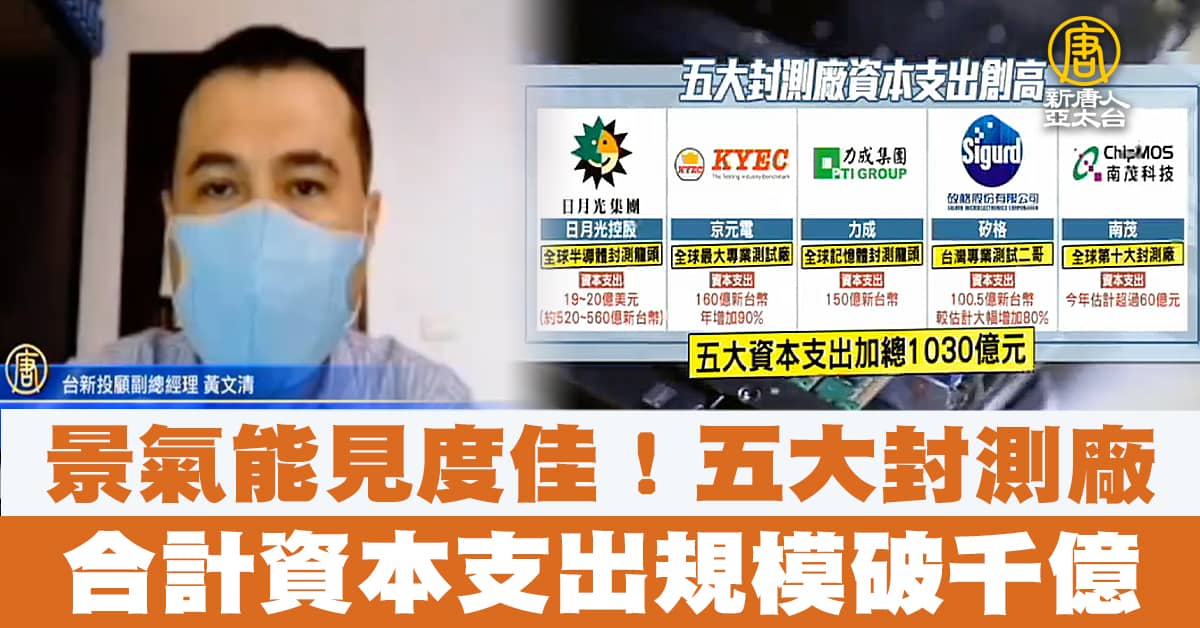 【新唐人亞太台 2021 年 07 月 19 日訊】觀察國內半導體景氣,一大指標就是下游封裝測試業者,國內五大代工廠,以日月光控股為首,今年資本支出大幅上調,合計高達千億規模,外界預估封測訂單漲價效應浮現,未來應運動能展望樂觀。