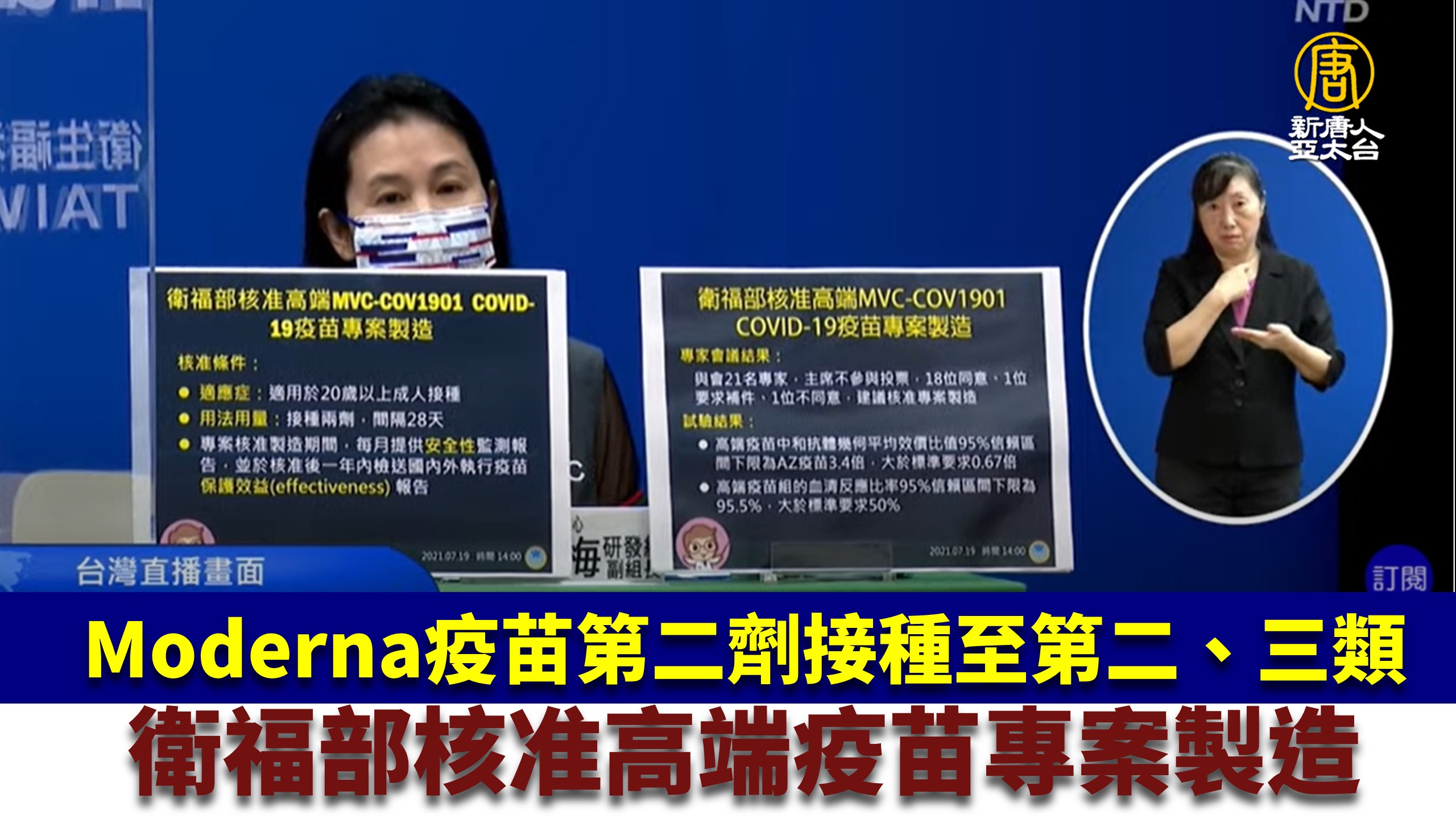 【新唐人亞太台 2021 年 07 月 19 日訊】今(18)日中央流行疫情指揮中心表示,Moderna疫苗第二劑接種對象擴及至第二類及三類,請各縣市及合約醫療院所加強推動符合資格民眾接種,Moderna疫苗自解凍後,可使用期間為30天(配送各縣市後以28天計算),自7月1、5、8及9日陸續配送至各地方政府衛生局或合約醫療院所的Moderna疫苗目前尚餘21萬570劑,將在7月29日至8月6日間到期,請各地方政府衛生局及合約醫療院所加強推動,針對原已符合第二劑接種間隔為至少28天的第一類、機組人員及孕婦等對象提供接種。