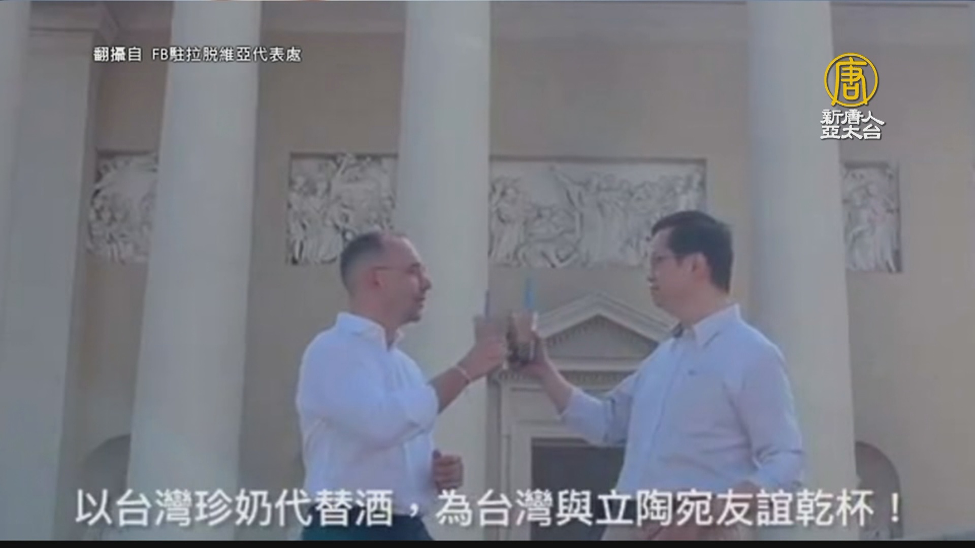 台灣駐拉脫維亞代表黃鈞耀,與立陶宛國會友台小組主席莫德基斯,一同在立陶宛首都維爾紐斯大教堂前拍攝,兩人手握台灣珍奶,以奶茶代酒,為台灣與立陶宛間的友誼「乾杯」。