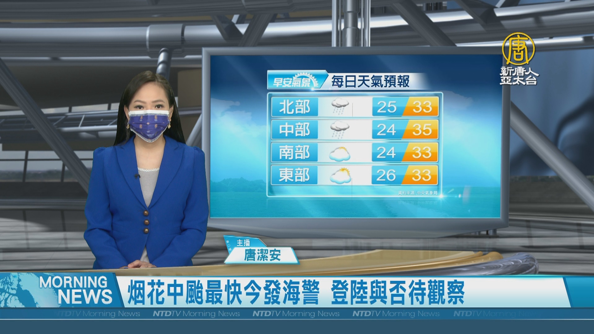 【新唐人亞太台 2021 年 07 月 21 日訊】歡迎您收看7月21日的早安新唐人,我是唐潔安,先來帶您關心天氣。根據氣象局最新預報,中度颱風烟花路徑有往北修,對台灣影響還是很大,暴風圈仍會影響到台灣,路徑仍可能變化,還需要再觀察。週五、週六(23日、24日)受到颱風影響最大,全台有雨,帶您一起來看到國際媒體重要訊息。