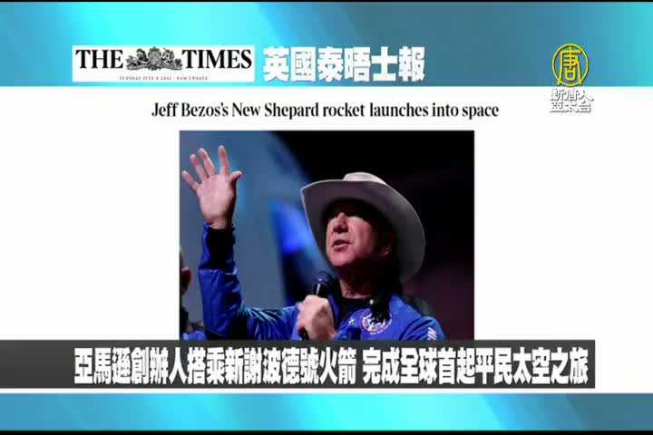 【新唐人亞太台 2021 年 07 月 21 日訊】接著是英國泰晤士報的報導:亞馬遜創辦人貝佐斯,搭乘自家藍源公司的新謝波德號火箭,完成全球首起平民太空之旅。