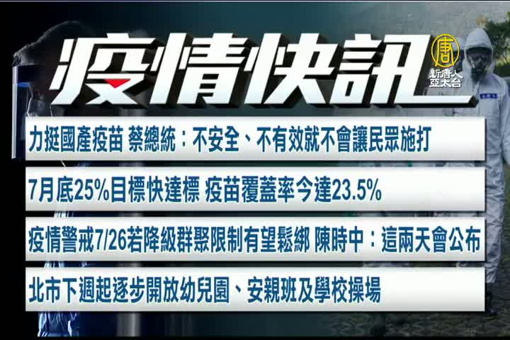 【新唐人亞太台 2021 年 07 月 21 日訊】來看台灣7月21日疫情快訊。蔡總統力挺國產疫苗,強調:若不安全、不有效,就不會讓民眾施打。疫苗覆蓋率週三已達23.5%,7月底25%的目標即將達標。7/26若降級,群聚限制將有望鬆綁嗎?指揮官陳時中指出:這兩天會公布。台北市下週起逐步開放幼兒園、安親班及學校操場。