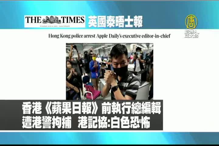 【新唐人亞太台 2021 年 07 月 22 日訊】接著是英國泰晤士報的報導:香港《蘋果日報》前執行總編輯遭港警拘捕,香港記者協會痛批白色恐怖。