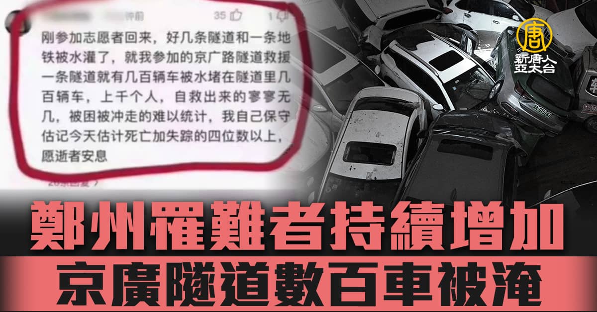 一名鄭州的志願者在網上發貼說,鄭州有幾條隧道和一條地鐵被灌水,僅京廣隧道被水堵在裡面的車,至少有幾百輛,上千人,自救出來的寥寥無幾,被困被沖走的難以統計,他自己保守估計,死亡和失蹤的人數在4位數以上。