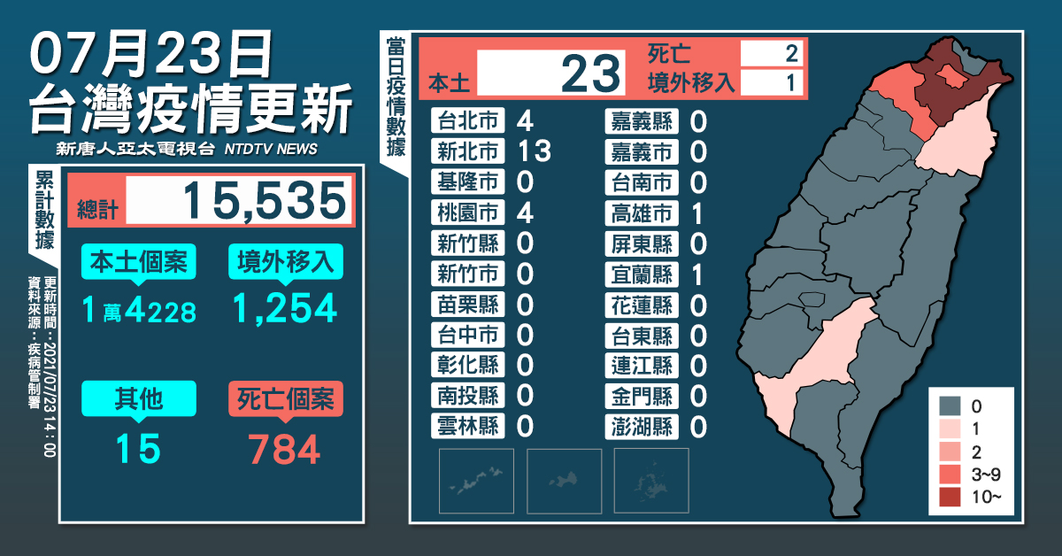 【新唐人亞太台 2021 年 07 月 23 日訊】今(23)日中央流行疫情指揮中心公布,國內新增23例本土及1例境外移入;另確診個案中新增2例死亡。
