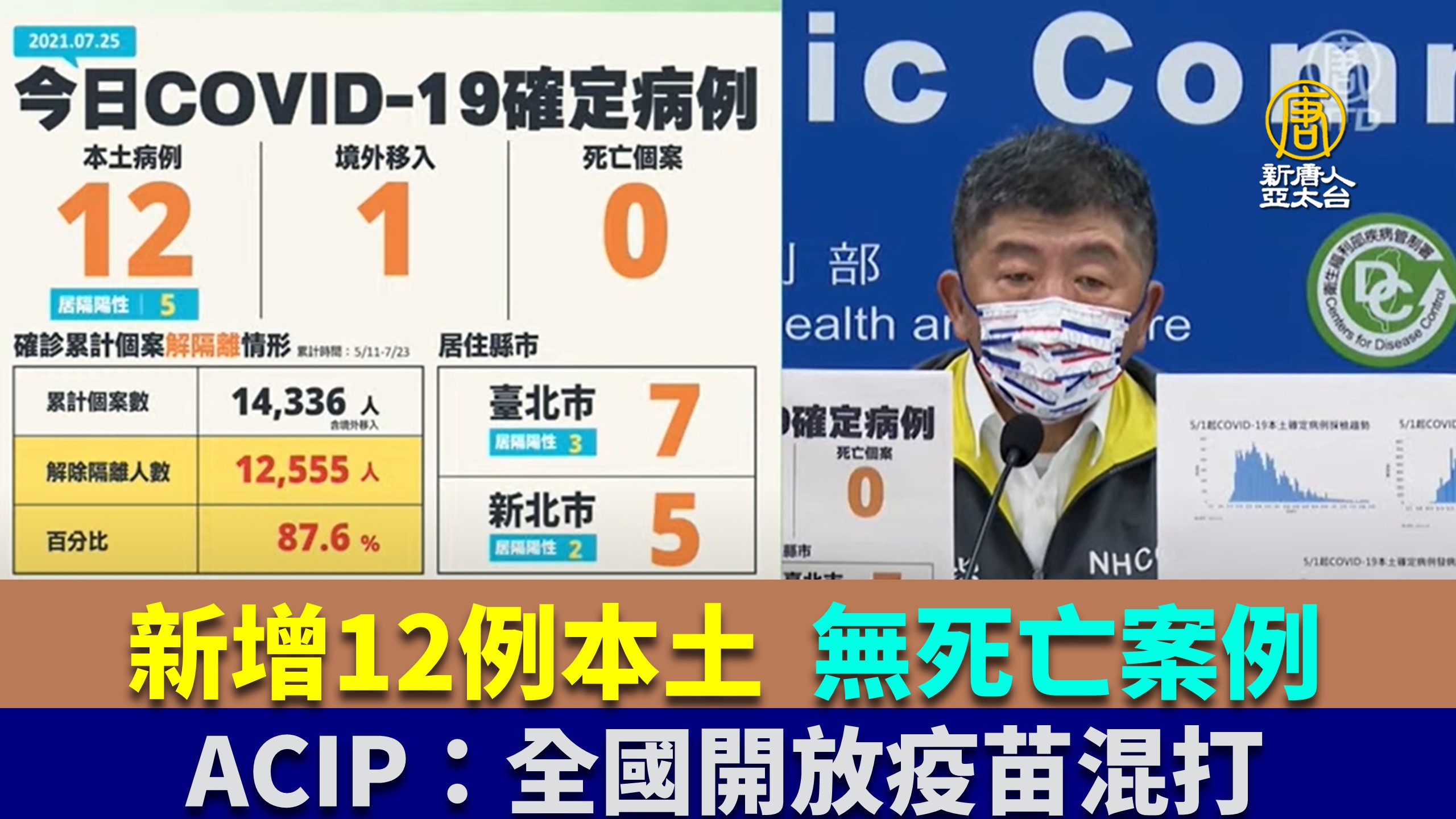 【新唐人亞太台 2021 年 07 月 25 日訊】今(25)日中央流行疫情指揮中心公布,國內新增12例本土及1例境外移入;另確診個案中無新增死亡。