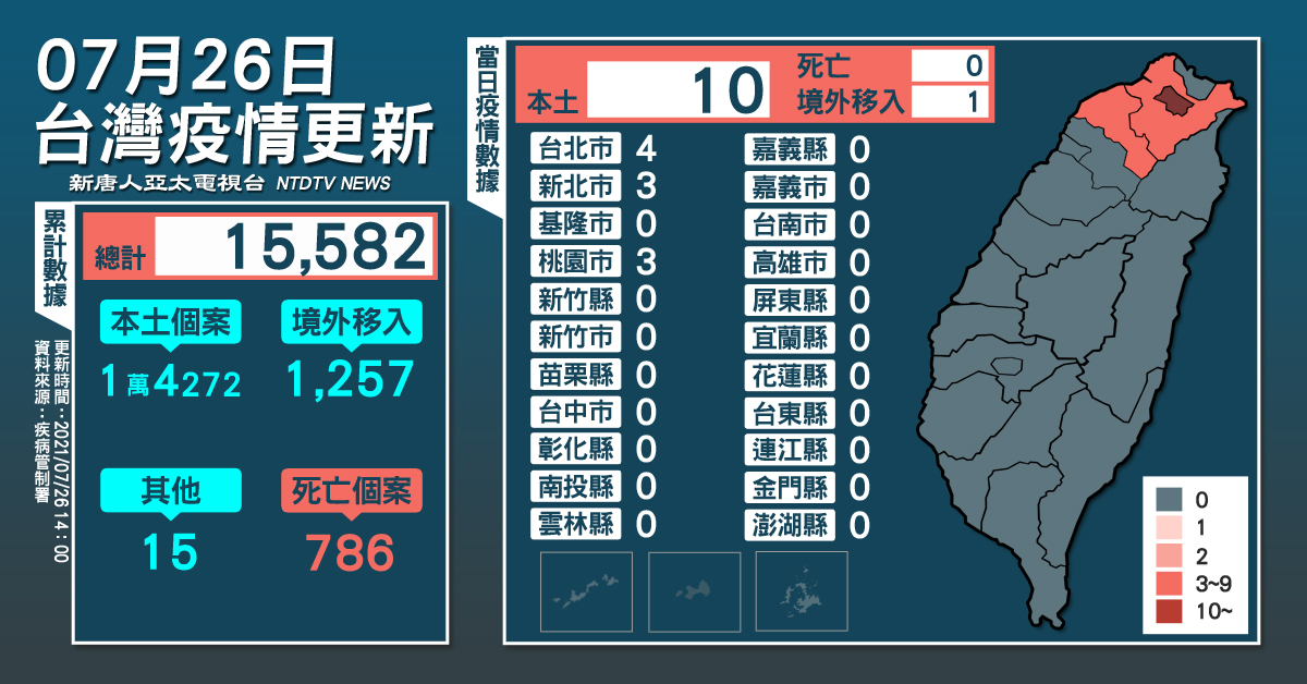【新唐人亞太台 2021 年 07 月 26 日訊】今(26)日中央流行疫情指揮中心公布,國內新增10例本土及1例境外移入;另確診個案中無新增死亡。