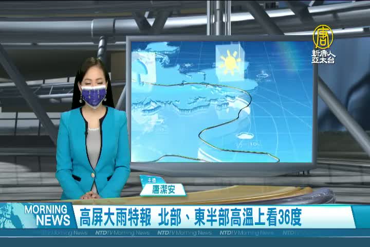【新唐人亞太台 2021 年 07 月 27 日訊】歡迎您收看7月27日的早安新唐人,我是唐潔安,先來帶您關心天氣。,今天受西南風影響,氣象局對高雄市、屏東縣發布大雨特報。另外,今天中午前後北台灣和花東高溫將達36度以上。提醒您留意。帶您一起來看到國際媒體重要訊息。