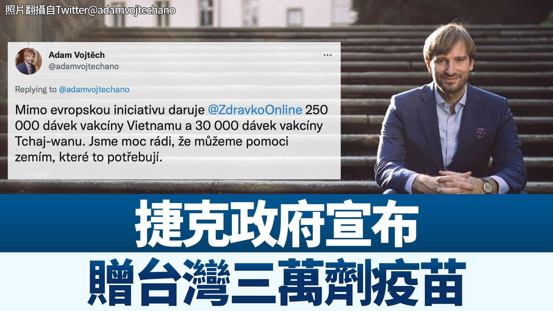 【新唐人亞太台 2021 年 07 月 27 日訊】早安新唐人先來關心,捷克政府今天召開內閣會議,會後衛生部長沃依泰赫宣布,將捐贈3萬劑疫苗給台灣。他在推特上寫到,將捐贈越南25萬劑疫苗,捐贈台灣3萬劑疫苗。根據歐盟會員國的承諾,捷克預定捐贈239萬劑疫苗給第三方國家。上週,友台的捷克議長韋德齊就已經透露政府將贈台疫苗的訊息,並親自與衛生部長通話;3萬劑疫苗數量,已超出媒體預估的2萬劑;不過,有捷克網友在衛生部長推特下方留言指出,幫助我們口罩生產線的台灣,疫苗數量只有越南十分之一?這是一種恥辱。而大量台灣網友,則是到韋德齊臉書下方留言感謝。