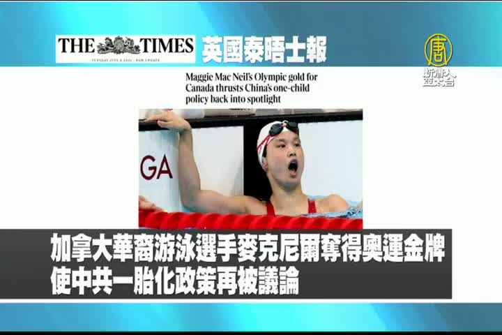 【新唐人亞太台 2021 年 07 月 28 日訊】接著是英國泰晤士報的報導:出生中國,1歲被領養的加拿大華裔游泳選手麥克尼爾,奪得奧運金牌,使中共一胎化政策再被議論。